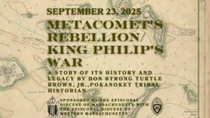Join with Episcopalians across the Commonwealth to learn about colonial America’s bloodiest conflict, a story many of us know very little about. Pokanoket Tribal Historian Don Strong Turtle Brown, Jr. will introduce us to how early skirmishes and clashes in culture from the Native peoples’ earliest contacts with Europeans led eventually to Metacoment’s Rebellion, commonly known as King Philip’s War. He will also tell how the legacy of that war lives on today and how Native peoples’ strength and resilience lives on. Sponsored by the Diocese of Massachusetts and the Diocese of Western Massachusetts and organized in response to the call from Bishops Whitworth and Fisher to commit our dioceses’ “to the spiritual work of racial reconciliation.”